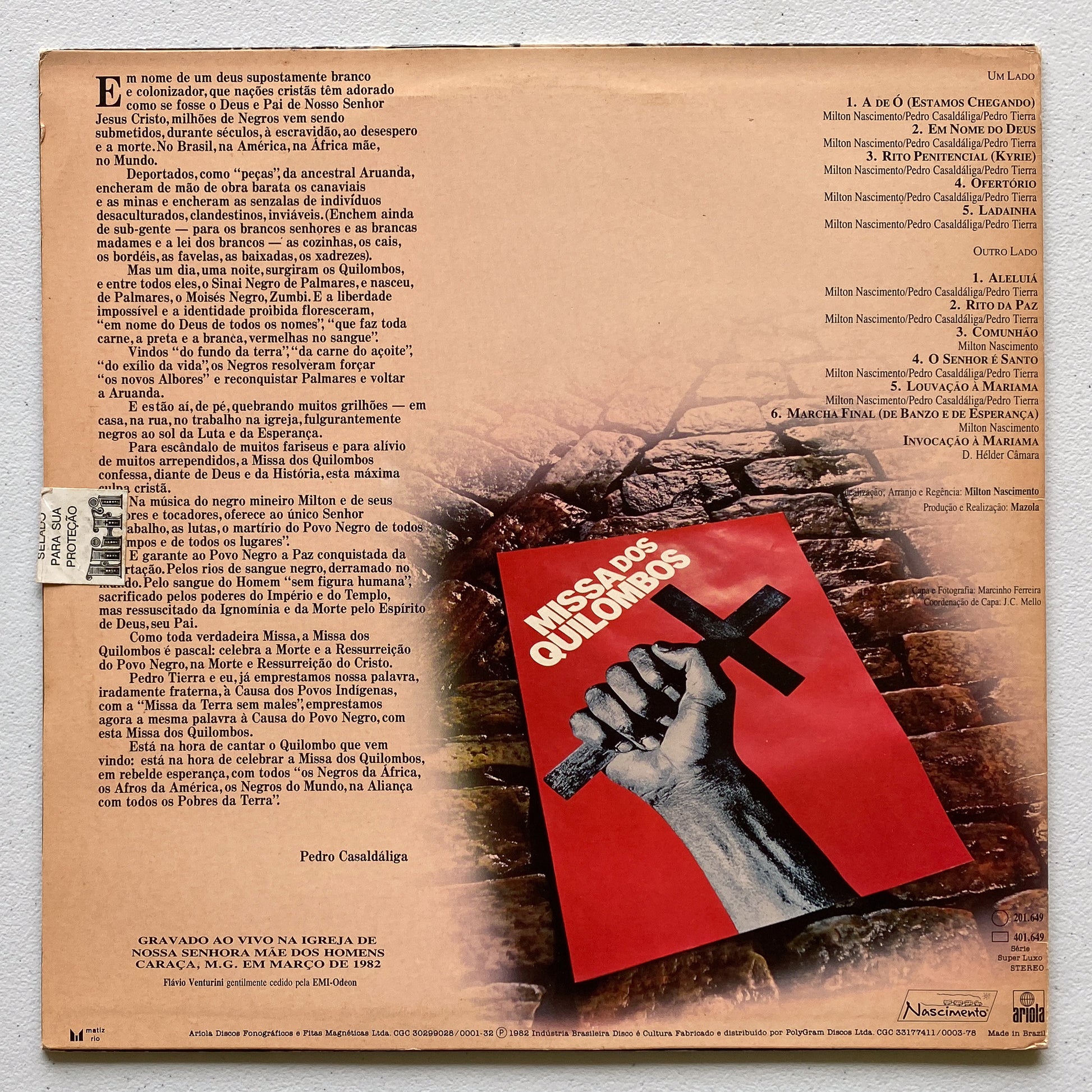 Discover the cultural and historical richness of Brazil with the LP "Missa Dos Quilombos," a collaborative masterpiece by Milton Nascimento, Pedro Casaldáliga, and Pedro Tierra. Released by Ariola Records, this vinyl presents a unique fusion of music and poetry, celebrating the resistance and spirituality of the quilombos. Combining Milton Nascimento's unmistakable voice with powerful and spiritual lyrics, this album is an emotional tribute to the fight for freedom and justice. Get this essential piece for collectors of Brazilian music and lovers of the country's cultural history now.